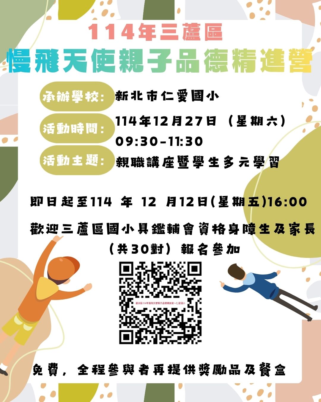 轉知:蘆洲仁愛國小新北市三蘆區114年「慢飛天使親子品德精進營」活動,歡迎本校學生與家長踴躍報名參加。